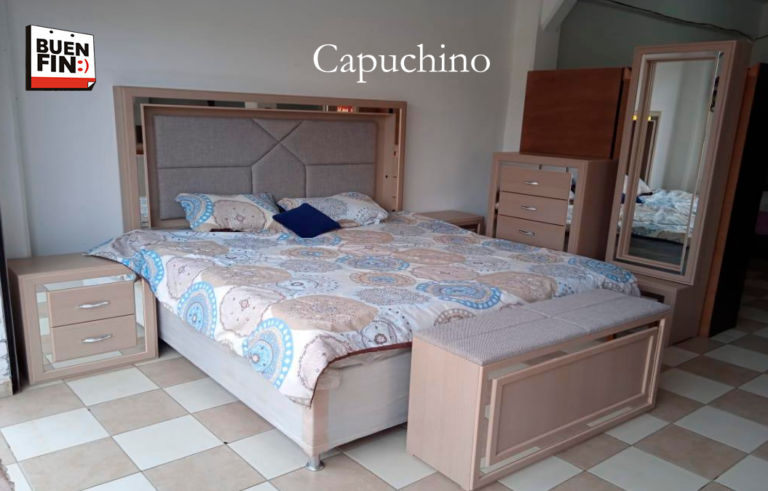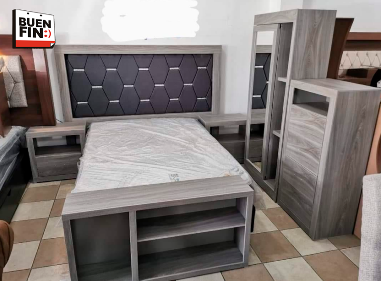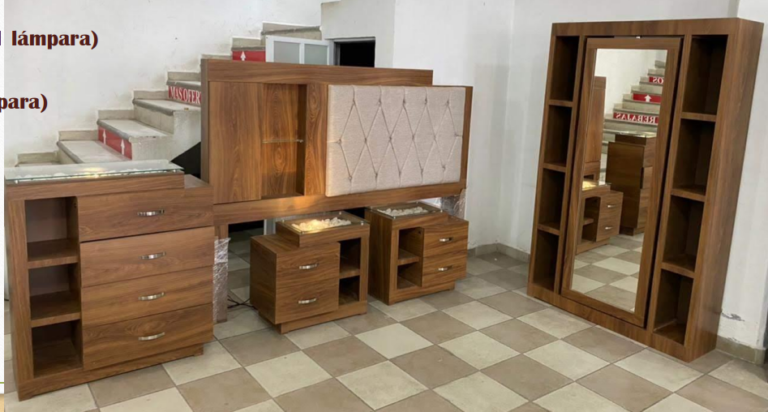 Incluye: 1 cómoda, 2 buros, 1 pie de cama, espejo giratorio con focos cabecera con…